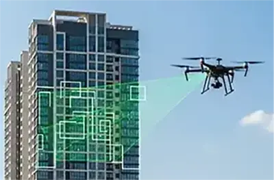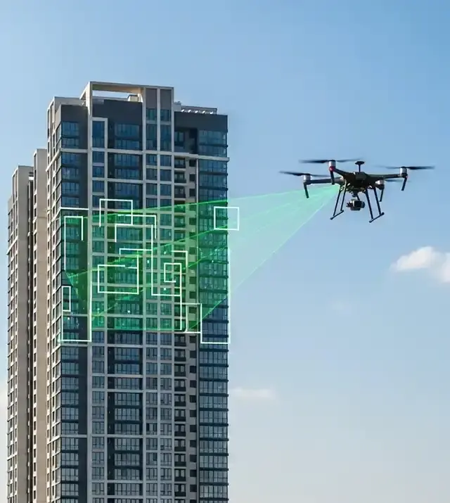 O drone capta toda a fachada em alta resolução, e o software gera um modelo 3D rastreável — algo impossível no método antigo.
